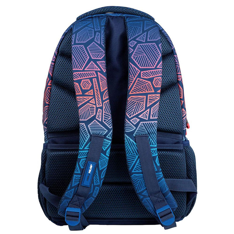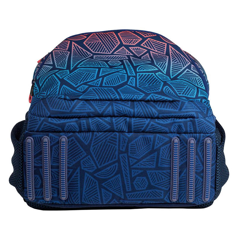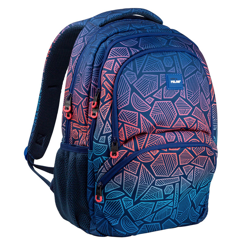 Mochila escolar con ilustraciones geométricas y tonos degradados. Cuenta con un bolsillo principal con compartimento interior protector para portátil, y 3 bolsillos delanteros. Dispone de dos bolsillos laterales, asas regulables, parte posterior acolchada y transpirable y base reforzada. Permite añadir un carrito porta-mochilas.