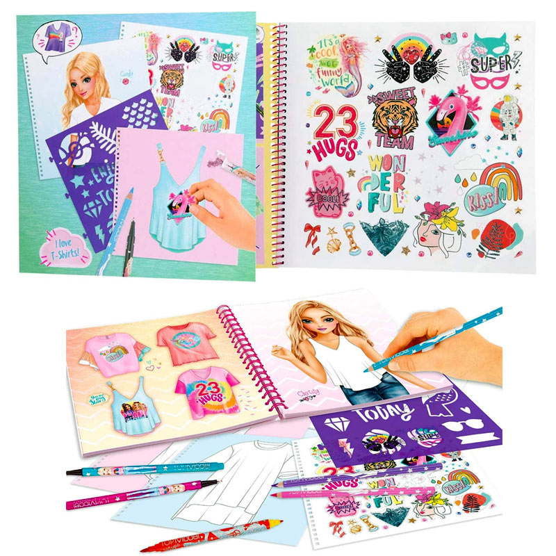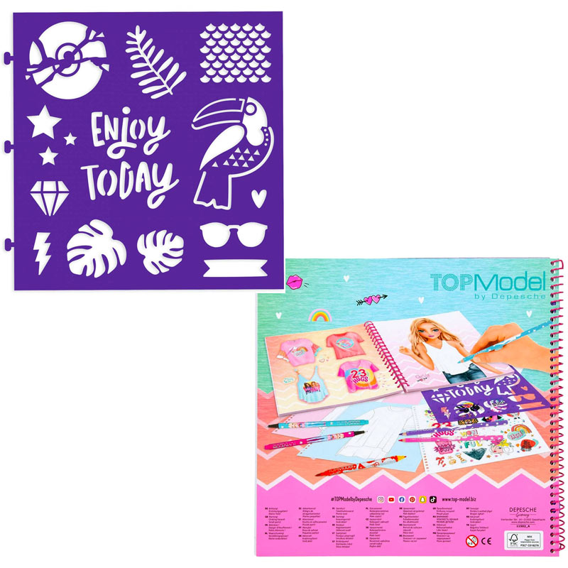 Con el libro para colorear de TOPModel puedes diseñar y crear atuendos individuales. En 60 páginas hay camisetas predibujadas que se pueden decorar con la plantilla incluida y las numerosas pegatinas. Así cada aspecto será un ejemplar único. Las plantillas mostradas sirven como sugerencia.